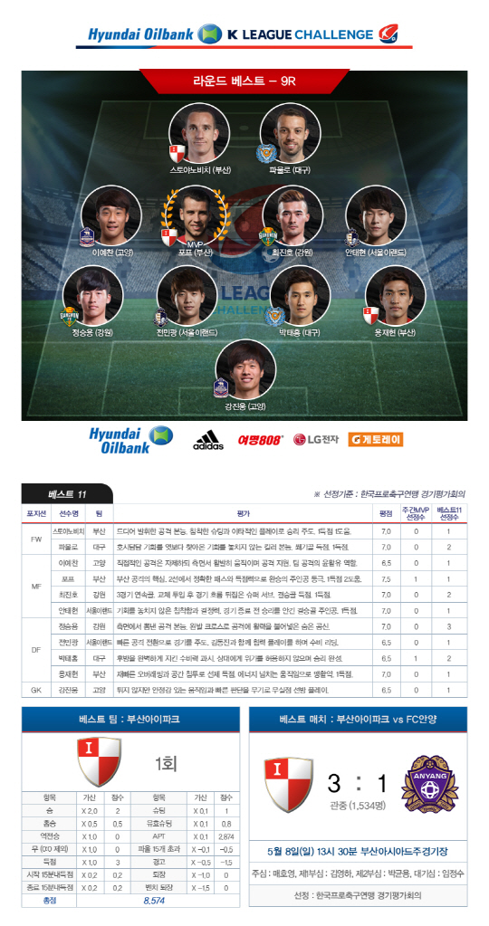 한편, 챌린지(2부 리그) 9라운드 MVP는 8일 안양전에서 1골-2도움을 기록한 포프(부산)이 차지했다. 챌린지 베스트11에는 포프를 비롯해 스토야노비치 용재현(이상 부산) 파울로 박태홍(이상 대구) 이예찬 강진웅(이상 고양) 최진호 정승용(이상 강원) 안태현 전민광(이상 이랜드)이 선정됐다.