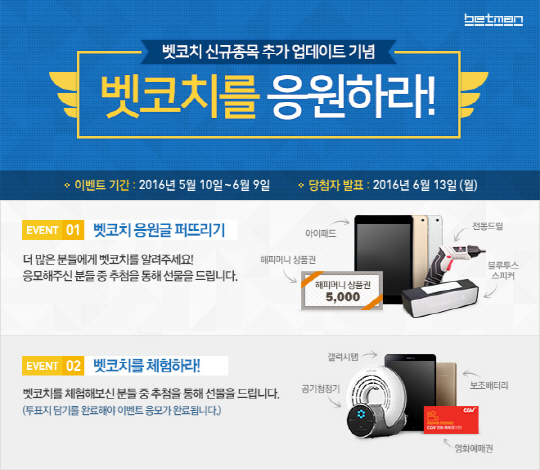 한편, 10일부터 한달 간 진행되는 이번 이벤트는 '벳코치 응원글 퍼뜨리기'와 '벳코치를 체험하라!'를 통해 참여할 수 있다.