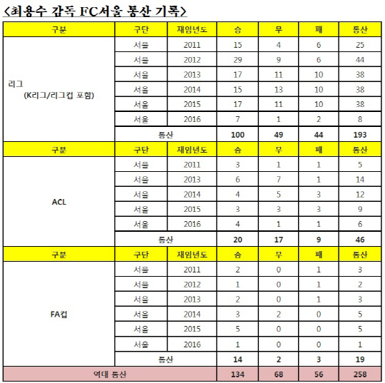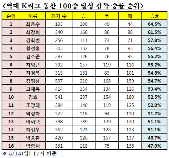FC서울을 맡은 지 어언 여섯 시즌째, 최용수 감독이 새로운 역사를 열고 있다. 1983년 태동한 K리그의 새로운 이정표, 역대 최단 기간 K리그 통산 100승(정규리그와 리그컵) 달성이다. 서울은 14일 탄천종합운동장에서 벌어진 2016년 현대오일뱅크 K리그 클래식 10라운드 성남과의 원정경기에서 역전, 재역전의 치열한 공방 끝에 3대2로 승리했다. 그 1승이 곧 역사가 됐다. 최 감독은 K리그 역대 최단인 193경기 만에 100승(49무54패)을 신고했다. 최강희 전북 감독과 고인이 된 차경복 전 성남 감독이 224경기 만에 챙긴 100승을 무려 31경기나 앞당겼다. 실제 나이(1971년생)가 아닌 호적(1973년 9월 10일)만 놓고 보면 최연소 100승 기록(42세 8개월 4일)도 세웠다. 박성화 전 포항 감독(44세 10개월 15일)의 기록을 경신했다. 동시에 K리그 통산 100승을 달성한 16명의 감독 가운데 64.5%(2위·최강희 감독 61.5%)이란 가장 높은 승률도 기록했다.