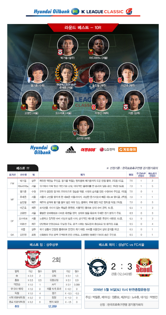 한편, 챌린지(2부 리그) 10라운드 MVP는 루키안(부천)이 차지했다. 챌린지 베스트11에는 루키안을 필두로 김동찬 조예찬(이상 대전) 한지호 이현승 신광훈(이상 안산) 바그닝요 유대현(이상 부천) 이원영(부산) 칼라일미첼(서울이랜드) 조현우(대구)가 선정됐다.