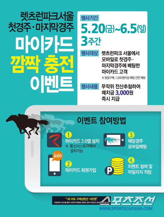 렛츠런파크 서울에서 시행되는 첫 경주와 마지막경주를 마이카드로 베팅한 고객 중 일부에게 전산추첨을 통해 예치금 3000원을 지급하는 행사다. 단, 이벤트 당일 1000원 이상 베팅한 경우에만 참여 가능하다. 이벤트 참여를 위해선 스마트폰에 마이카드 2.0앱을 설치하고, 마이카드 회원 가입 후 해당경주에 모바일로 베팅하면 된다.