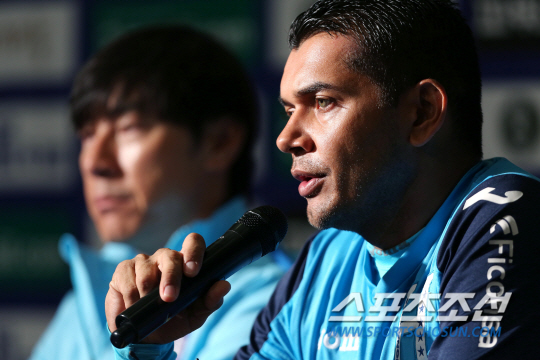 기자회견 중인 아마도 궤바라 온두라스 올림픽대표팀 수석코치. 사진제공=대한축구협회