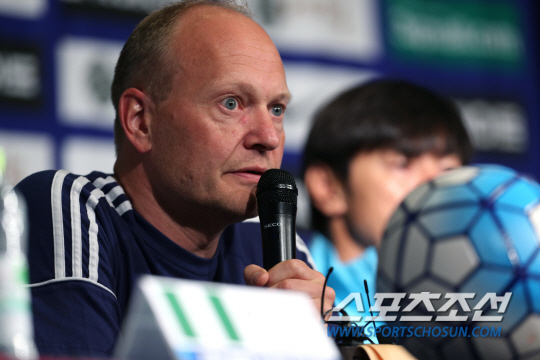 공식 기자회견에서 질문에 답변하고 있는 닐스 프레드릭슨 덴마크 올림픽대표팀 감독. 사진제공=대한축구협회