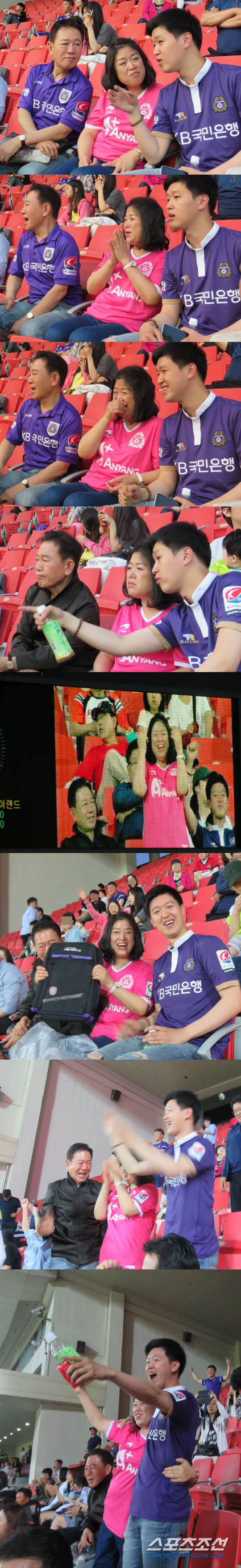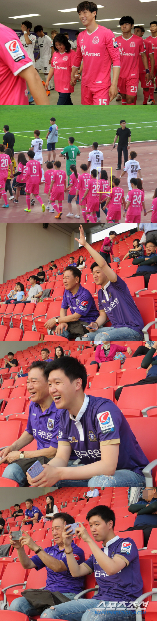 이날 안양은 안방에서 거짓말처럼 펄펄 날았다. '엄마의 파트너' 김태호 역시 기대를 저버리지 않았다. 온가족이 15번을 응원했다. 전반 20분 김태호가 상대의 결정적인 찬스를 온몸으로 막아내자 난리가 났다. "김태호 잘한다. 엄마 기운을 받아서 그래." 민수군이 엄지를 번쩍 치켜올렸다. 축구장이 처음인 부모님을 위해 아들 민수군은 끊임없이 룰과 상황을 설명했다. 스포츠 마니아인 아버지는 축구장에 폭풍적응했다. 어머니 역시 처음이라 믿어지지 않을 만큼 적극적인 관중 매너를 보여줬다. 축구를 진심으로 즐겼다. 전반 30분 정재용의 선제골이 터지자 가족이 벌떡 일어섰다. 하이파이브가 작렬했다.
