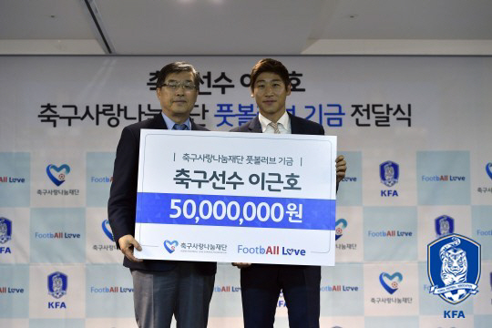 축구사랑나눔재단은 이근호의 기부금 중 1000만원을 불의의 사고 뒤 재활 중인 전 제주 공격수 신영록에게 전달하기로 했다. 나머지 4000만원 및 축구용품은 재단 사업에 활용키로 했다. 이갑진 재단 이사장은 "이근호가 축구로부터 얻은 성공의 일부를 그 노력의 땀이 채 식기도 전에 함께하는 실천의 모범을 보여 주었다. 이는 더 많은 물질을 가졌기 때문이 아니라, 나눔에 대한 마음이 풍성하기 때문이라고 생각한다"며 "이번 기부를 계기로 앞으로 제2, 제3의 이근호 선수가 나와서 현역 선수들은 물론 축구계 전반에 축구사랑 나눔의 문화가 튼튼하게 뿌리 내릴 수 있기를 바란다"고 밝혔다.