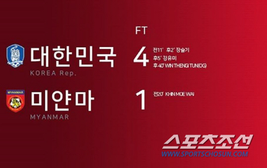 이어진 후반. 윤덕여호의 골 행진이 막이 올랐다. 후반 2분 만에 선제골의 주인공 장슬기가 추가골을 넣었고 불과 3분 뒤 강유미가 세 번째 득점을 올렸다. 행운도 따랐다. 후반 40분 미얀마의 윈텡툰이 자책골을 넣았다. 이후 추가 득점은 없었다. 경기는 4대1 윤덕여호의 승리로 마무리됐다.