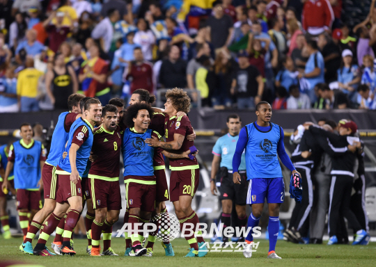 베네수엘라 선수들이 10일 우루과이와의 경기에서 승리한 뒤 기쁨을 나누고 있다.ⓒAFPBBNews = News1