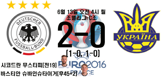 독일은 13일 새벽 4시(한국시각) 프랑스 릴에서 열린 우크라이나와의 C조 1차전에서 2대0으로 승리했다. 만족할만한 경기력은 아니었다. 제로톱을 들고나왔지만 기대에 미치지 못했다. 그럼에도 '점유율 극대화→세트피스골→수비 집중→용병술→역습 쐐기골'이라는 공식을 잘 따랐다. 전반 19분만에 무스타피의 선제 헤딩골로 앞서나갔다. 우크라이나의 파상공세를 견뎌낸 뒤 적절한 시간에 선수 교체를 단행했다. 그리고 경기 종료 직전 교체투입된 슈바인슈타이거가 쐐기골을 박았다. 승점 3점 획득의 가장 빠른 공식을 따랐다.