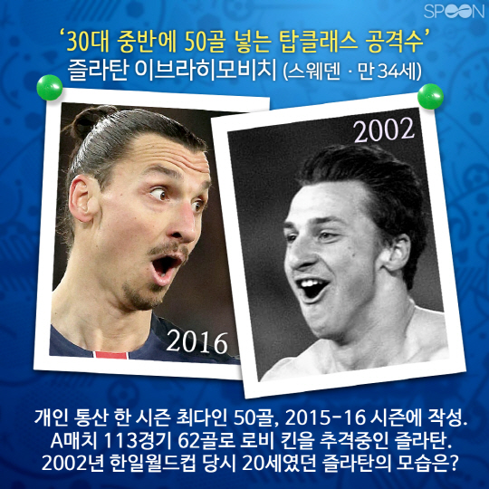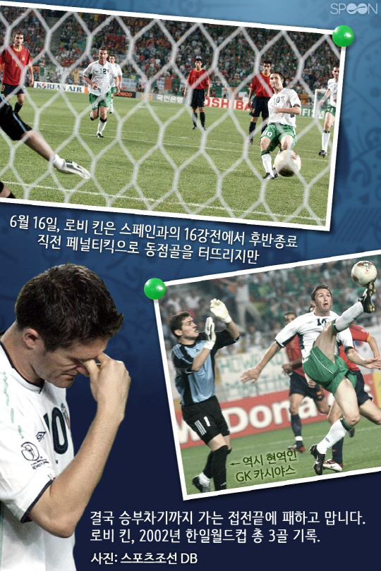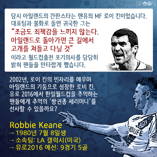 세월 앞에 장사 없듯, 올 4월 김남일 선수가 은퇴를 선언했습니다. 이제 2002년 한일월드컵 대표팀 4강 멤버 중 현영민(전남)만이 유일하게 현역으로 뛰는 선수입니다. 그런데 2002년 월드컵은 물론 유로2016에서도 당당히 대표로 이름을 올린 선수들이 있습니다. 바로 잔루이지 부폰(38·이탈리아), 이케르 카시야스(34·스페인), 로비 킨(35·아일랜드), 즐라탄 이브라히모비치(34·스웨덴)입니다. 이중 로비 킨과 즐라탄은 주장이자 간판 공격수로 14일 새벽 맞대결을 펼치게 됩니다. 적지 않은 나이에도 건재함을 과시하며 기대를 모으는 두 선수…한일 월드컵 시절은 어땠을까요? 14년의 세월을 거슬러 올라 추억 돋는 사진과 함께 이들의 꽃청춘 시절을 소개합니다.