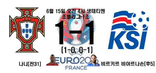 1-1로 맞선 후반 추가시간. 포르투갈을 프리킥을 얻었다. 문전 앞 33m 정도 지점이었다. 키커는 당연히 호날두였다. 호날두는 볼을 놓고 뒤로 물러섰다. 그리고 특유의 자세를 취했다. 전 관중이 숨을 죽였다. 호날두의 강력한 프리킥은 수비벽을 맞고 튕겼다. 아이슬란드 팬들은 환호를, 포르투갈팬들은 머리를 감싸쥐었다. 이때 주심이 휘슬을 불었다. 아이슬란드 수비진의 핸드볼 파울. 28m 지점에서 다시 프리킥을 찼다. 이번에도 호날두였다. 하지만 이번에도 벽에 막혔다. 주심의 경기 종료 휘슬. 호날두는 아쉬운듯한 미소로 경기를 끝냈다.
