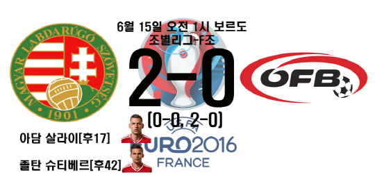 하지만 뚜껑을 열어보니 달랐다. 오스트리아를 상대로 마법을 펼쳤다. 대등한 경기로 전반을 마쳤다. 후반 들어 헝가리는 변수를 잘 활용했다. 오스트리아의 에이스 유누조비치가 부상으로 빠졌다. 구심점을 잃은 오스트리아는 흔들렸다. 헝가리는 이를 놓치지 않았다. 후반 17분 아담 살라이가 선제골을 넣었다. 1골차 리드를 잘 지켜나가던 헝가리는 후반 42분 슈티베르가 쐐기골을 박았다. 44년만의 한을 풀었다.