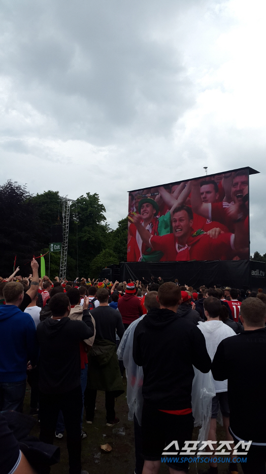 경기 시작 10분전 하늘에서 장대비가 내렸다. 몇몇은 우산을 펼쳤다. 하지만 대부분의 팬들은 비를 맞으면서 경기를 지켜봤다. 옷이 젖어도, 땅이 진흙으로 바뀌어도 개의치 않았다. 오로지 스크린만 바라보며 선수들에 플레이에 집중했다. 판정 하나하나에 소리를 쳤다. 야유와 응원이 교차했다. 웨일스는 수비에 집중했다. 잉글랜드의 슈팅이 나올 때마다 팬들도 거기에 반응하며 신음소리를 냈다. 슈팅을 막아내면 박수가 이어졌다.