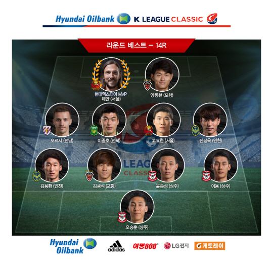 클래식 13라운드 베스트 11도 공개됐다. 최고 공격수에는 데얀과 함께 양동현(포항)이 이름을 올렸다. 베스트 미드필더에는 오르샤(전남), 이종호(전북), 고요한(서울), 진성욱(인천)이 선정됐다. 최고의 수비수에는 김용환(인천) 김광석(포항) 윤준성 이 용(이상 상주)이 뽑혔다. 상주의 오승훈은 최고 골키퍼로 선정됐다.