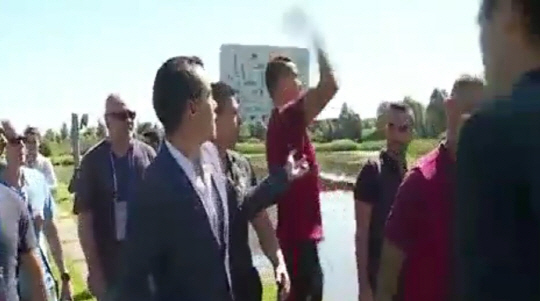 하지만 호날두는 발끈했다. 그는 그 기자가 들이댄 마이크를 잡아챘다. 그러더니 바로 옆에 있던 호수로 마이크를 던져버렸다. 기자는 황당해했다. 호날두의 주위에 있던 보디가드들은 이 기자를 호날두에게서 떼어놓았다.