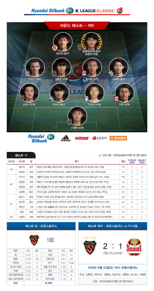 한편, 챌린지(2부 리그) 19라운드 MVP는 정우재(대구)가 차지했다. 챌린지 베스트11에는 정우재를 비롯해 루키안 바그닝요 강지용 류원우(이상 부천) 김영후(안양) 황지웅 이현승 최보경(이상 안산) 이재권(대구) 이규로(서울이랜드)가 선정됐다.