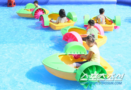 워터바이크는 5세에서 11세 어린이 전용 물놀이 시설로 스피돔 중앙광장에 설치된 풀장에서 즐길 수 있다.