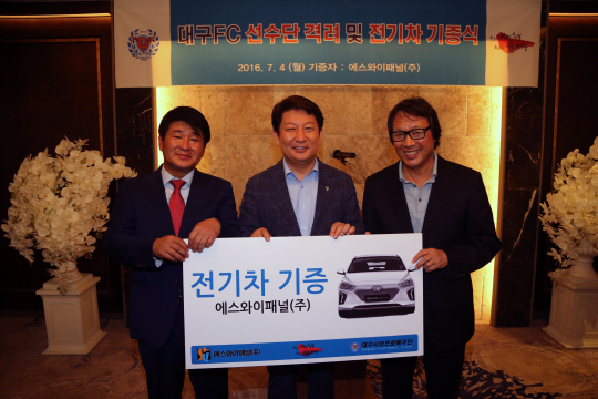 대구시가 미래자동차 산업의 핵심이 될 전기차 보급 확대를 적극 추진하고 있는 가운데, 시민구단 대구FC가 에스와이패널로부터 전기차를 기증받았다.