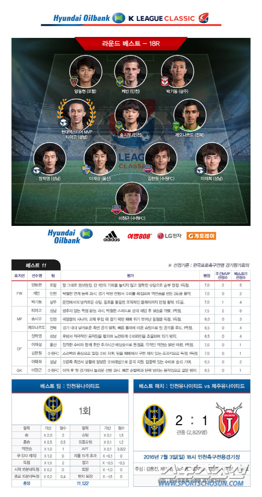 클래식 16라운드 베스트 11도 발표됐다. 최고 공격수에는 양동현(포항) 케빈(인천) 박기동(상주)이 선정됐다. 미드필더에는 티아고와 함께 송시우(인천) 레오나르도(전북)가 자리를 잡았다. 최고의 수비수에는 장학영(성남) 이재성(울산) 김한원(수원FC) 이태희(성남)가 이름을 올렸다. 이창근(수원FC)은 최고 골키퍼로 뽑혔다. 18라운드 베스트팀은 인천, 베스트매치는 인천-제주전이 각각 선정됐다.