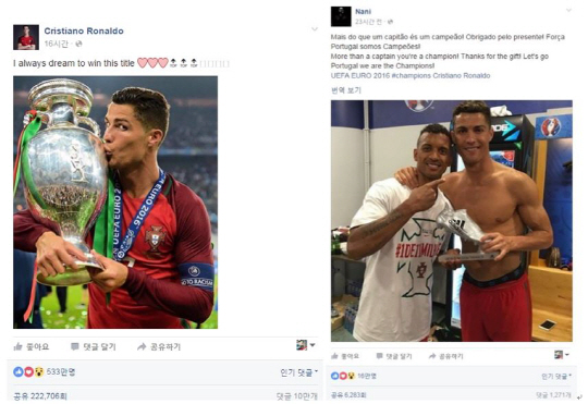 결승전 직후 호날두가 자신의 페이스북에 올린 우승컵에 입맞추는 사진에는 무려 533만건의 리액션(좋아요, 최고예요 등)과 22만여건의 공유, 10만개의 댓글이 달려 현존 최고 공격수에 대한 팬들의 무한 사랑을 입증했다.