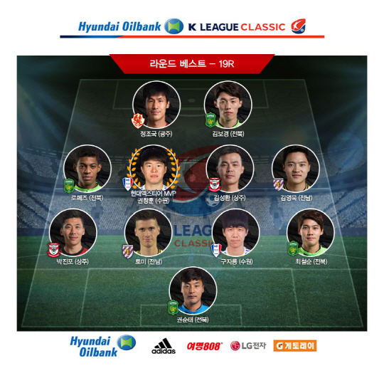 19라운드 베스트11에서는 포워드 부문에 정조국(광주)과 김보경(전북)이, 미드필더에선 권창훈을 비롯해 로페즈(전북), 김성환(상주) 김영욱(전남)이 각각 이름을 올렸다. 수비수 부문에는 박진포(상주) 구자룡(수원) 최철순(전북), 토미(전남)가 이름을 올린 가운데 19라운드 최고 골키퍼는 권순태(전북)가 뽑혔다.