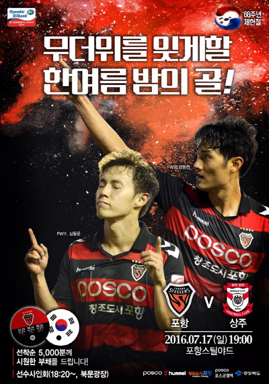 포항 스틸러스가 17일 오후 7시 홈경기장인 스틸야드에서 상주상무를 상대로 2016년 현대오일뱅크 K리그 클래식 20라운드를 치른다.