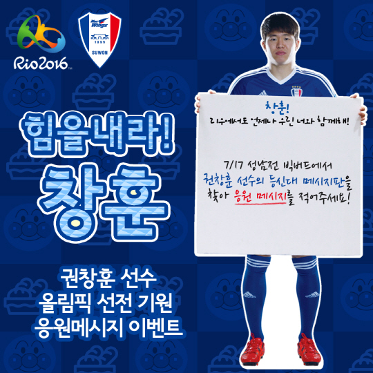 수원 삼성이 권창훈의 2016년 리우올림픽에서의 선전을 기원하는 '힘내라 창훈아!' 응원메시지 전달 행사를 진행한다.