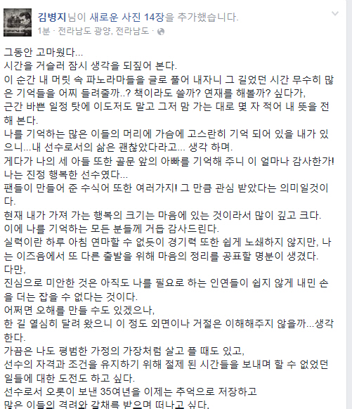 너무나 긴 시간 선수로 지내왔기에 익숙하지 않다.그 간 여기저기 많은 분들께 수도 없이 받아 왔던 질문에 대해 이렇게 일단락 지어 본다.