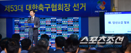 당선 직후 정 회장은 "축구계 1선 현장의 소중한 의견을 반영해서 서로 존중하는 한국 축구 분위기를 만들겠다. 이를 통해 온 국민이 축구를 즐길 수 있도록 ㅎ겠다"면서 "참석해주신 모든 분들께 감사를 드린다. 앞으로도 한국 축구 발전을 위해 최선의 노력을 다 할 것"이라고 말했다.