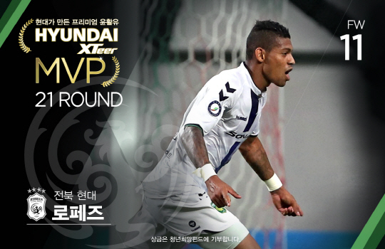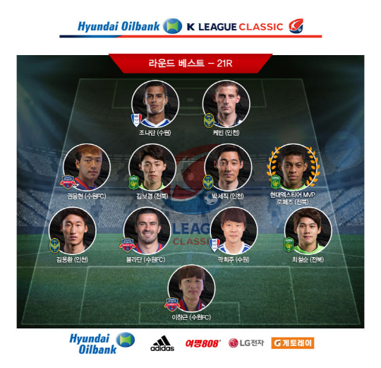 로페즈는 20일 서울월드컵경기장에서 열린 FC서울전에서 멀티골을 터뜨리면서 팀의 21경기 연속 무패(12승9무)를 이끌었다. 21라운드 베스트11에는 로페즈를 비롯해 최철순 김보경(이상 전북) 조나탄 곽희주(이상 수원 삼성) 권용현 블라단 이창근 (이상 수원FC) 케빈 박세직 김용환(이상 인천)이 꼽혔다.