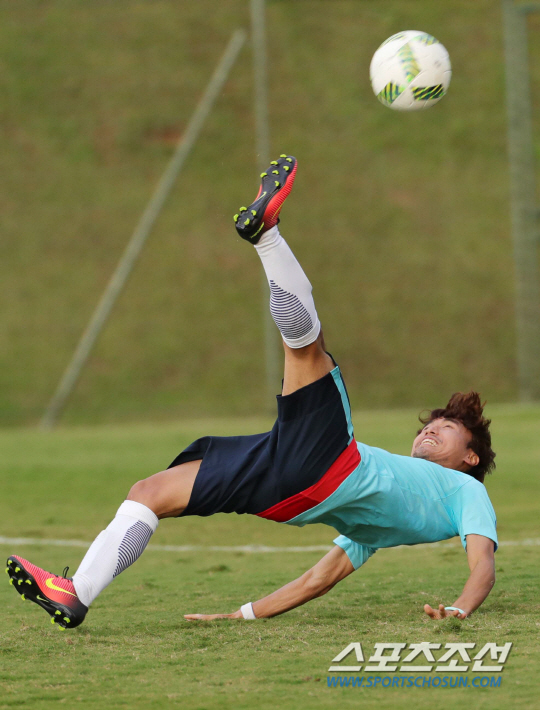 올림픽축구대표 문창진이 27일 오후(현지시간) 브라질 상파울루 주 버본 아치바이아(Bourbon Atibaia)리조트호텔 간이구장에서 슛 팅 연습을 하고 있다./2016.7.27 상파울루=올림픽사진공동취재단 I/