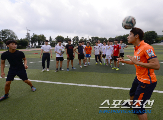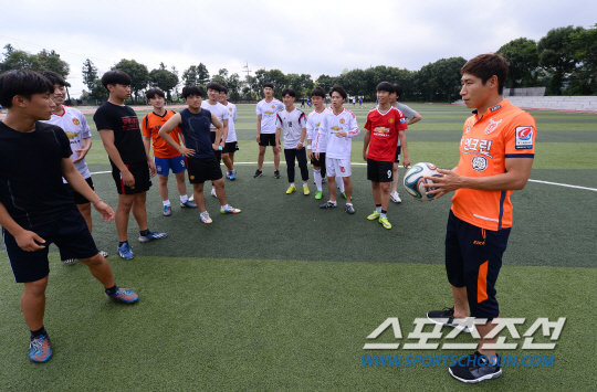햇볕이 쨍쨍하게 내리쬐던 7일 제주 남주고등학교 운동장. 난데없이 불호령이 떨어졌다. K리그 클래식 제주 유나이티드의 '돌격 대장' 이근호(31)가 떴다. 혼자가 아니었다. 신태용호의 일원으로 2016년 리우데자네이루올림픽에 나서는 미드필더 이창민(22)도 함께 왔다. 프로스포츠 발전을 위해 스포츠조선과 한국프로스포츠협회가 공동으로 펼치고 있는 대국민 특별캠페인 '이웃집에 프로가 산다'의 13번째 주인공은 이근호와 이창민이었다.