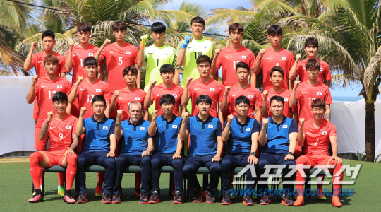 올림픽축구대표가 1일 오전(현지시간) 브라질 바이아 사우바도르 Gran Hotell Stella Maris 호텔에서 포즈를 취하고 있다. 신태용호 완전체가 된 올림픽축구 대표팀은 오는 4일 사우바도르 Fonte Nova Arena(아레나 폰치노바)에서 피지전, 7일 독일전, 10일 브라질 브라질리아 Mane Garrincha Stadium(마네 가린샤 경기장)에서 멕시코전을 치를 예정이다./2016.8. 01 사우바도르=올림픽사진공동취재단 I/
