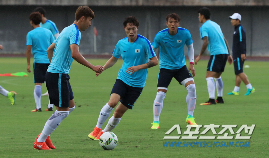 2016년 리우올림픽 남자축구 손흥민 등 선수들이 1일 오후(현지시간) 브라질 사우바도르 피투아쿠 경기장(Pituacu stadium)에서 비를 맞으며 훈련에 열중하고 있다. /2016.8. 01 사우바도르=올림픽사진공동취재단 I/