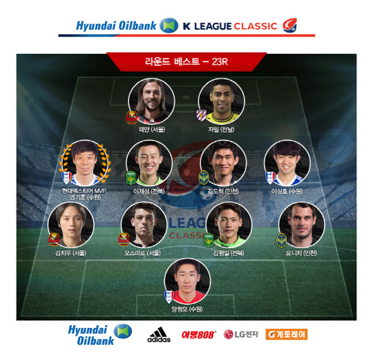 23라운드 베스트 공격수 부문에는 자일(전남)과 데얀(서울)이 선정됐다. 미드필더 부문에는 염기훈을 비롯해 이상호(수원)와 김도혁(인천), 이재성(전북)이 이름을 올렸다. 수비수 부문에는 요니치(인천)와 김형일(전북), 오스마르와 김치우(이상 서울)이 뽑혔다. 수원의 양형모는 23라운드 최우수 골키퍼로 평가됐다. 이번 라운드 베스트팀은 수원, 베스트매치는 수원-제주전이 각각 선정됐다.