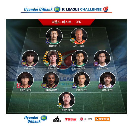 한국프로축구연맹은 3일 정성민을 챌린지 26라운드 최우수선수(MVP)로 선정했다. 프로연맹 경기평가위원회는 '시즌 첫 해트트릭의 주인공. 파괴력 높은 슈팅을 앞세워 대승(4대1)을 주도했다'고 MVP 선정 배경을 밝혔다. 정성민은 팀 동료 이현승 신형민을 비롯해 루이스 허범산 함석민(이상 강원) 서용덕 이상우(이상 안양) 진대성 장클로드(이상 대전) 이학민(부천)과 함께 26라운드 베스트11에도 선정됐다. 대구를 4대1로 대파한 안산은 26라운드 베스트팀에 선정됐다.
