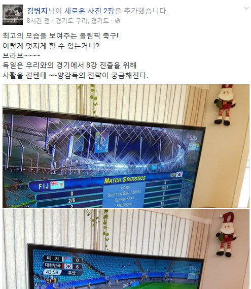 8대0 대승 직후 김병지는 자신의 페이스북을 통해 실시간 관전 인증샷과 함께 후배들을 향한 칭찬의 메시지를 남겼다. '최고의 모습을 보여주는 올림픽 축구! 이렇게 멋지게 할 수 있는 거니? 브라보~~~~'라고 썼다. 조별리그 2차전 독일전에 대한 기대도 감추지 않았다. '독일은 우리와의 경기에서 8강 진출을 위해 사활을 걸텐데 ~~양감독의 전략이 궁금해진다'고 덧붙였다.
