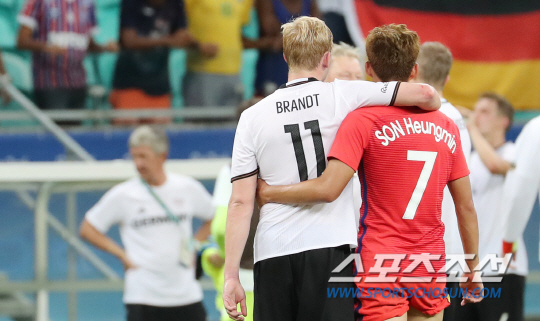 한국 축구대표 손흥민이 7일 오후(현지시간) 브라질 사우바도르 폰치노바 아레나에서 열린 2016리우올림픽 남자축구 조별리그 C조 2차전 독일전이 끝난후 독일선수들의 위로를 받고 있다/2016.8.7/ 사우바도르=올림픽사진공동취재단 J