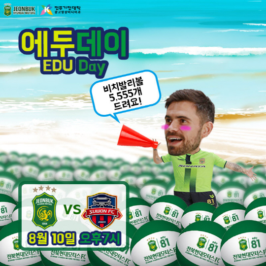 먼저 성공률 100%를 보이고 있는 선수 데이 이벤트 3탄'에두 Day'를 실시한다. 전북은 에두 비치볼 5555개를 제작, 각 게이트에서 선착순 증정한다. 또 특별 제작된 에두 티켓을 현장 발권하고 시즌권 소지자에겐 경기 후 지정 매표소에서 기념으로 지급한다.