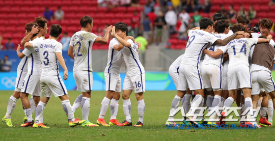 한국축구대표 권창훈, 손흥민 등 선수들이 10일 오후(현지시간) 2016년 리우올림픽 남자축구 C조 3차전 멕시코전이 열린 브라질 브라질리아 Mane Garrincha Stadium(마네 가힌샤 경기장)에서 멕시코를 1:0으로 승리하며 8강에 진출하자 환호하고 있다./2016.8.10 브라질리아=올림픽사진공동취재단