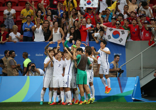 올림픽 축구대표가 10일 오후(현지시간) 2016 리우데자네이루 올림픽 남자축구 C조 멕시코와의 3차전을 펼쳤다. 브라질리아 마네 가린샤 경기장에서 권창훈이 한골을 넣어 1대 0으로 승리했다. 경기를 마친 뒤 선수들과 응원단들이 기뻐하고 있다.2016/8.10/브라질리아=올림픽사진기자단 D