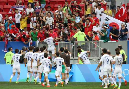 11일(한국시각), 리우올림픽 남자축구 조별리그 3차전, 멕시코에게 1대0 짜릿한 승리를 거두고 조1위로 8강행을 확정지은 순간, 태극전사들이 붉은 유니폼 물결이 넘실대는 관중석을 향해 내달렸다.