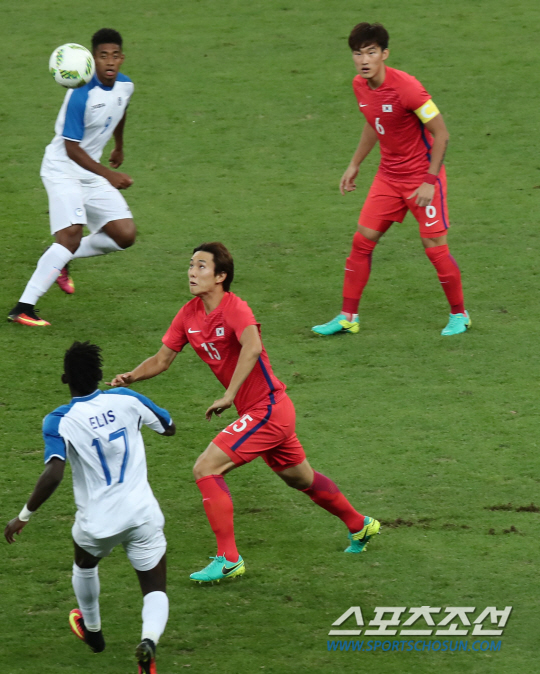 한국축구대표가 13일 오후(현지시간) 2016리우올림픽 남자축구 8강전 온두라스전이 열린 브라질 벨루오리존치 미네이랑 경기장에서 정승현 선수가 수비를 하고 있다.