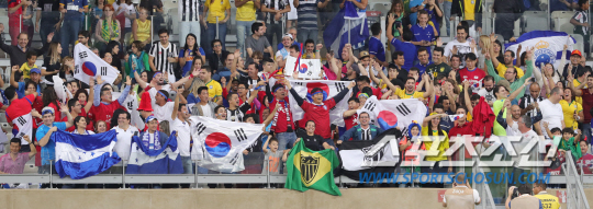 13일 오후(현지시간) 2016년 리우올림픽 남자축구 8강전 한국-온두라스전이 열린 브라질 벨루오리존치 미네이랑 경기장에서 수 많은 한국 팬들이 태극기를 들고 응원하고 있다./2016.8.13 벨루오리존치=올림픽사진공동취재단