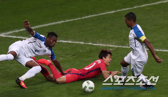 한국축구대표가 13일 오후(현지시간) 2016리우올림픽 남자축구 8강전 온두라스전이 열린 브라질 벨루오리존치 미네이랑 경기장에서 류승우 선수가 수비수의 발에 걸려 넘어지고 있다.