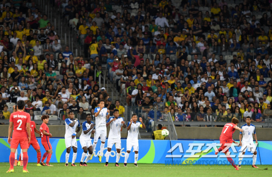 한국 축구대표팀 손흥민이 13일 오후(현지시간) 브라질 벨루오리존치 미네이랑 경기장에서 열린 2016 리우올림픽 축구 8강전 온두라스와의 경기에서 온두라스 문전에 강력한 프리킥을 시도하고 있다./2016.8.13/ 벨루오리존치=올림픽사진공동취재단