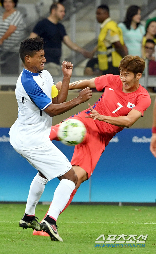 한국축구대표가 13일 오후(현지시간) 2016년 리우올림픽 남자축구 8강전 온두라스전이 열린 브라질 벨루오리존치 미네이랑 경기장에서 손흥민이 발리슛을 하고 있다./2016.8.13 벨루오리존치=올림픽사진공동취재단