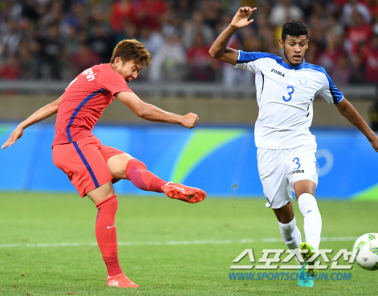 한국 축구대표팀 손흥민이 13일 오후(현지시간) 브라질 벨루오리존치 미네이랑 경기장에서 열린 2016 리우올림픽 축구 8강전 온두라스와의 경기에서 슛팅을 시도하고 있다./2016.8.13/ 벨루오리존치=올림픽사진공동취재단