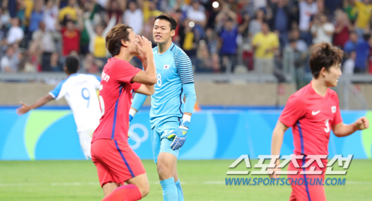 한국축구대표 구성윤, 정승현이 13일 오후(현지시간) 2016년 리우올림픽 남자축구 8강전 온두라스전이 열린 브라질 벨루오리존치 미네이랑 경기장에서 후반 선제골을 허용하자 아쉬워 하고 있다./2016.8.13 벨루오리존치=올림픽사진공동취재단