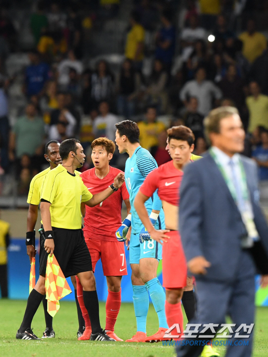 신태용 감독이 이끄는 한국 축구대표팀이 13일 오후(현지시간) 브라질 벨루오리존치 미네이랑 경기장에서 열린 2016 리우올림픽 축구 8강전 온두라스와의 경기에서 1대0으로 패하며 4강 진출에 실패했다. 경기가 종료된 후 손흥민이 들어가려는 심판을 막아서며 어필을 하고 있다./2016.8.13/ 벨루오리존치=올림픽사진공동취재단