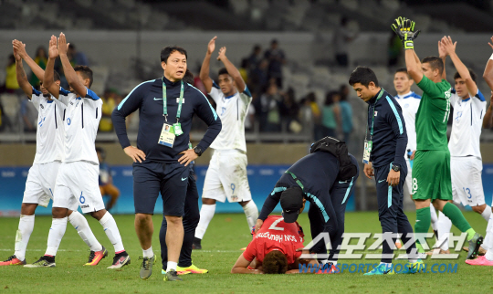 한국축구대표가 13일 오후(현지시간) 2016년 리우올림픽 남자축구 8강전 온두라스전이 열린 브라질 벨루오리존치 미네이랑 경기장에서 패한뒤 손흥민이 그라운드에 누워 울고 있자 뒤로 온두라스 선수들이 환호하며 지나고 있다./2016.8.13 벨루오리존치=올림픽사진공동취재단